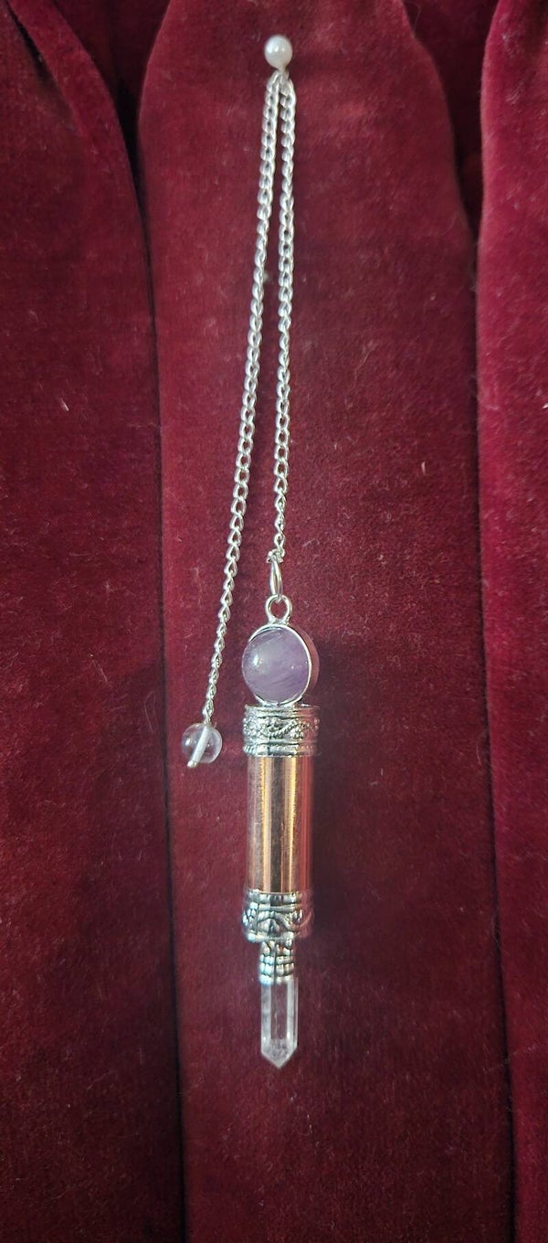COPPER WAND PENDULUM W/AMETHYST BALL AND CRYSTAL POINT