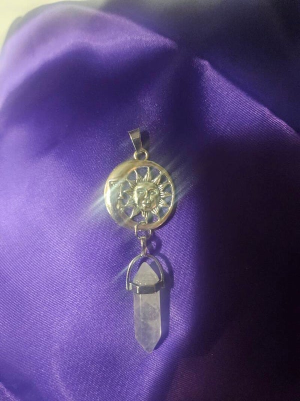 STERLING SILVER SUN AND MOON WITH DOUBLE POINTED NATURAL QUARTZ CRYSTAL PENDANT